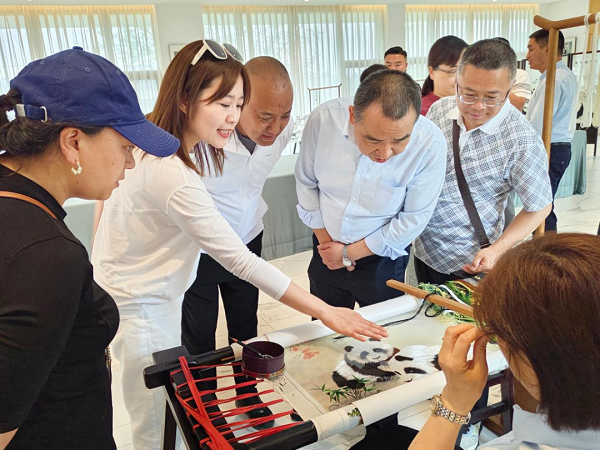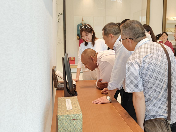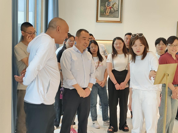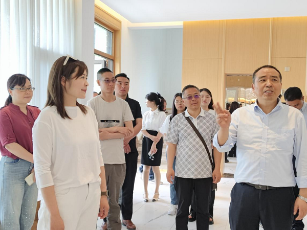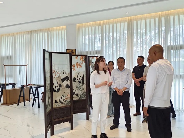 王东一行先后参观了“千鹤丝语”蚕桑文化展示中心、葚红酒庄、桑田茶社等地。薛忆首先对王东一行的到来表示热烈欢迎,随后详细介绍了天虹丝绸的基本情况、业务运行模式和特色亮点。每到一处,调研组成员都认真聆听,仔细参观,了解天虹丝绸的发展模式和基本情况,感受传统的蚕桑文化。
